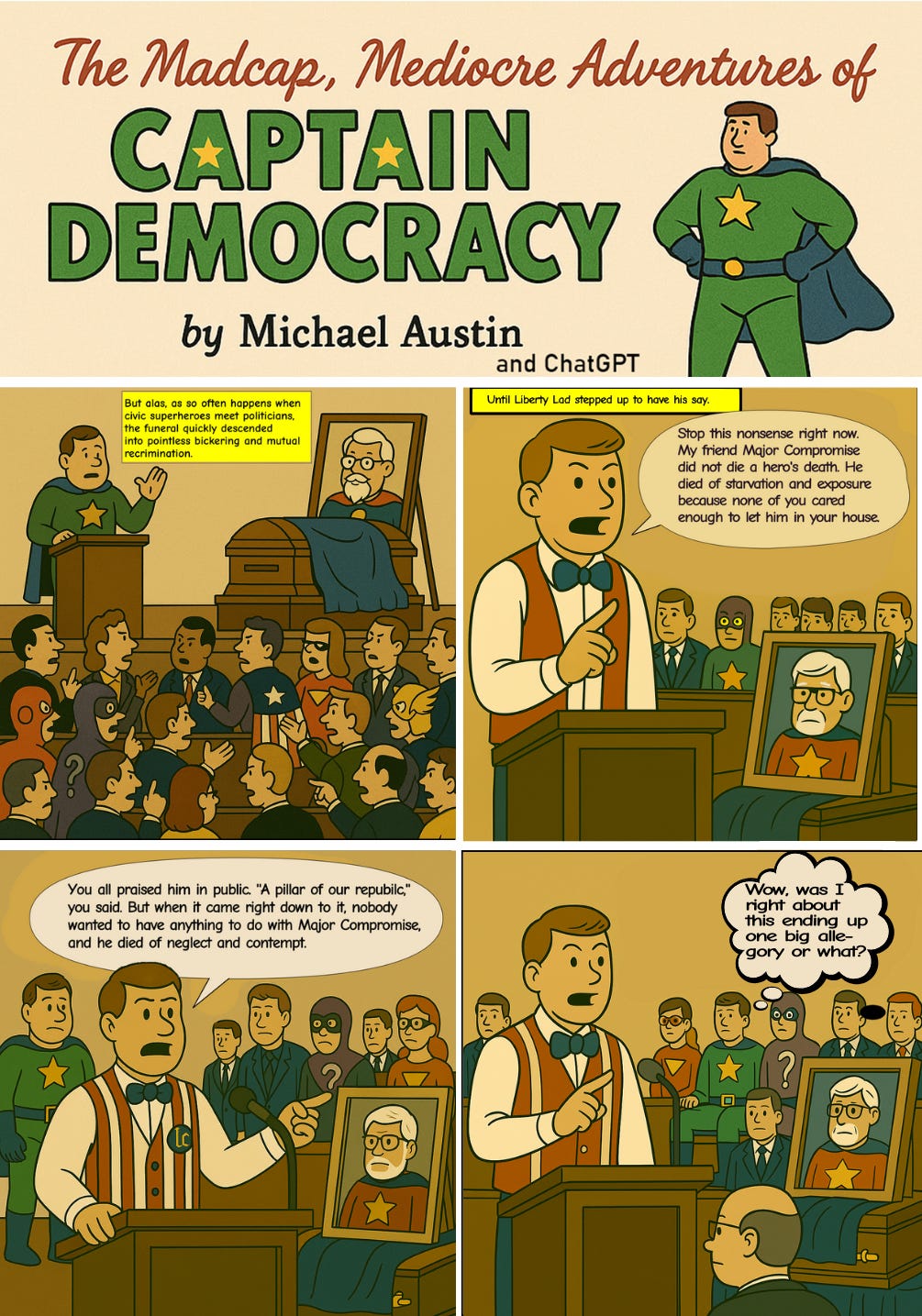 Captain Democracy is a combination of political interest, snark, and my increasing fascination with the creative potential of Artificial Intelligence. I have wanted to be a comic book artist for many years, but I can’t draw a stick figure to save my life. In collaboration with ChatGPT, however, I have found that I can live my dream and have an AI bot draw the pictures. Thus was born Captain Democracy: the hero we deserve.
