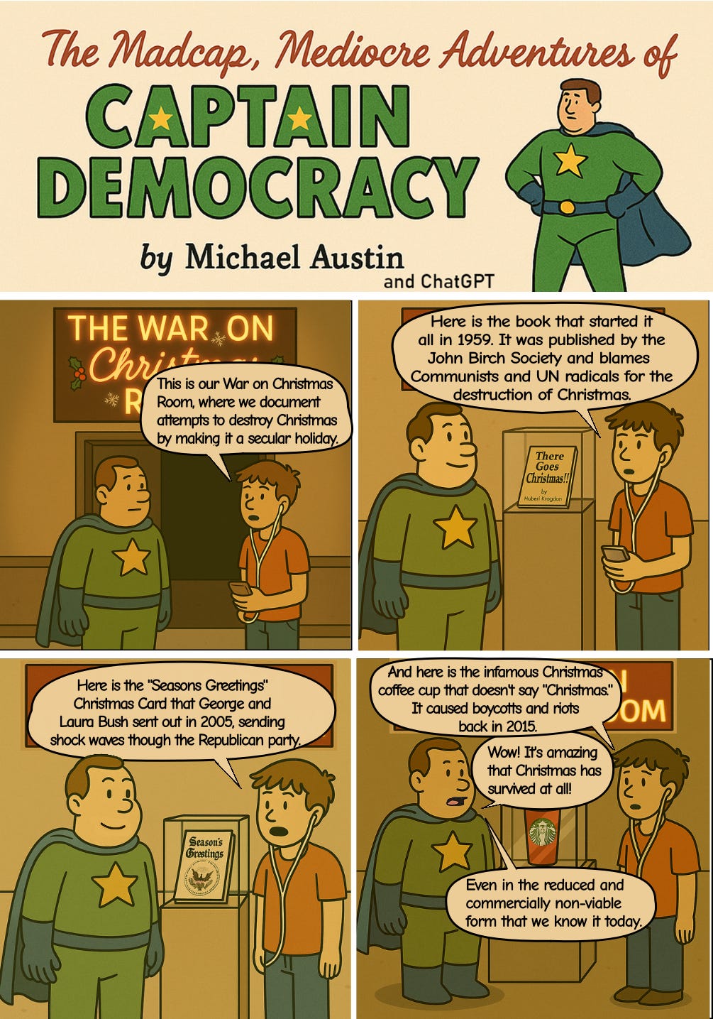 Captain Democracy is a combination of political interest, snark, and my increasing fascination with the creative potential of Artificial Intelligence. I have wanted to be a comic book artist for many years, but I can’t draw a stick figure to save my life. In collaboration with ChatGPT, however, I have found that I can live my dream and have an AI bot draw the pictures. Thus was born Captain Democracy: the hero we deserve. New episodes of Captain Democracy are published 3 times a week, on Mondays, Wednesdays, and Fridays.