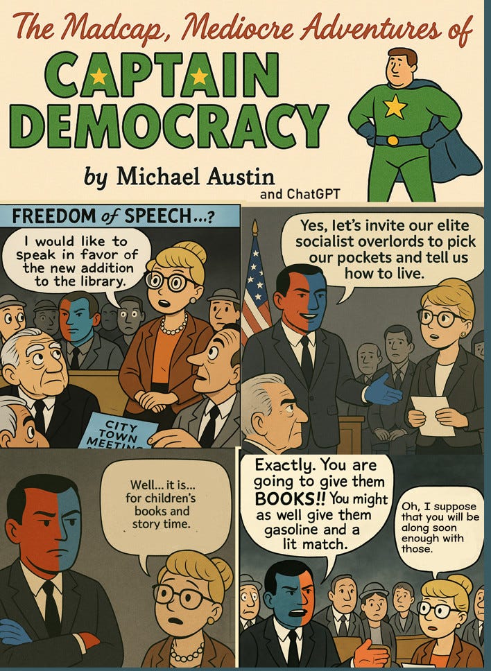Captain Democracy is a combination of political interest, snark, and my increasing fascination with the creative potential of Artificial Intelligence. I have wanted to be a comic book artist for many years, but I can’t draw a stick figure to save my life. In collaboration with ChatGPT, however, I have found that I can live my dream and have an AI bot draw the pictures. Thus was born Captain Democracy: the hero we deserve. New episodes of Captain Democracy are published 3 times a week, on Mondays, Wednesdays, and Fridays.