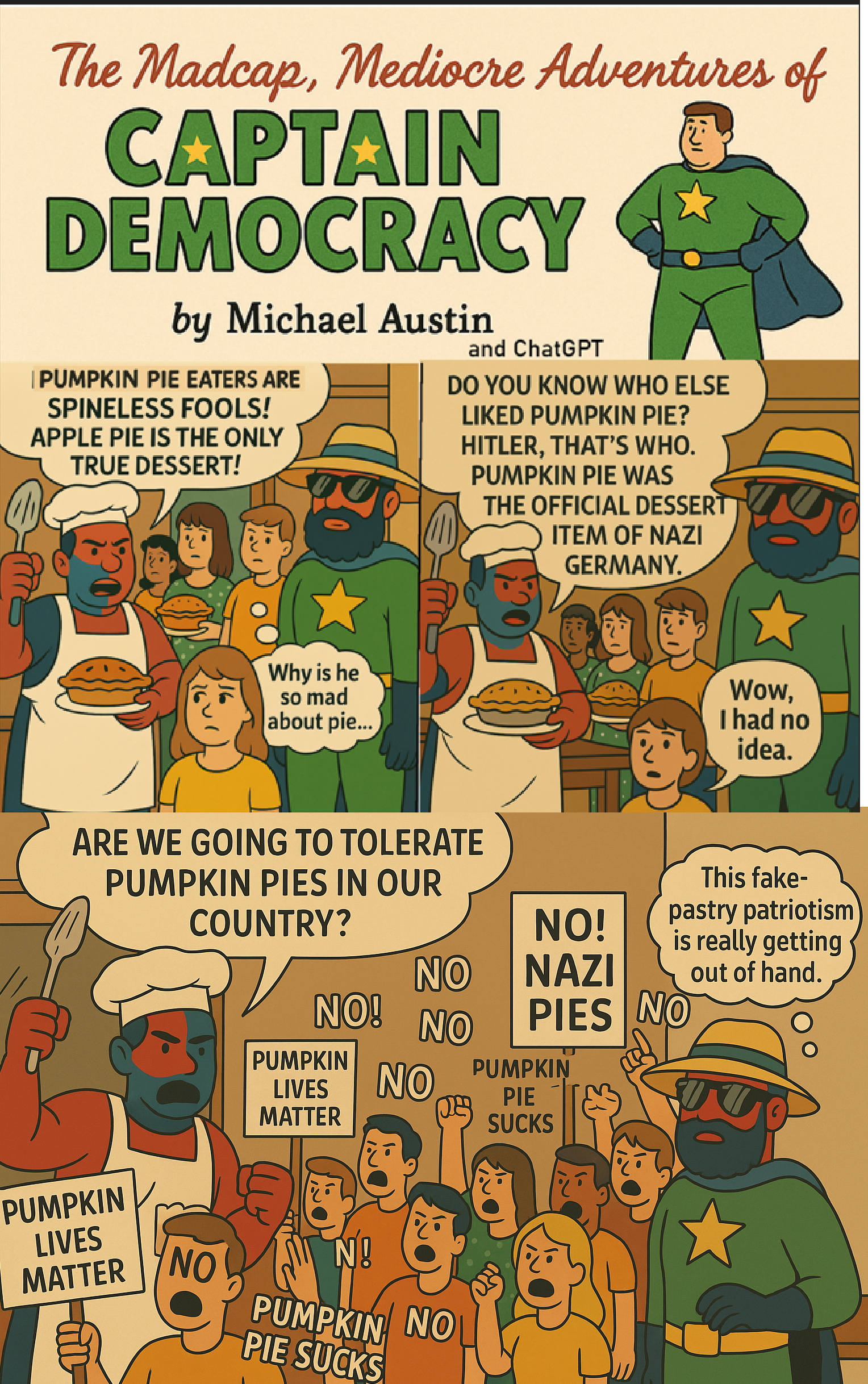 Captain Democracy is a combination of political interest, snark, and my increasing fascination with the creative potential of Artificial Intelligence. I have wanted to be a comic book artist for many years, but I can’t draw a stick figure to save my life. In collaboration with ChatGPT, however, I have found that I can live my dream and have an AI bot draw the pictures. Thus was born Captain Democracy: the hero we deserve. New episodes of Captain Democracy are published 3 times a week, on Mondays, Wednesdays, and Fridays.