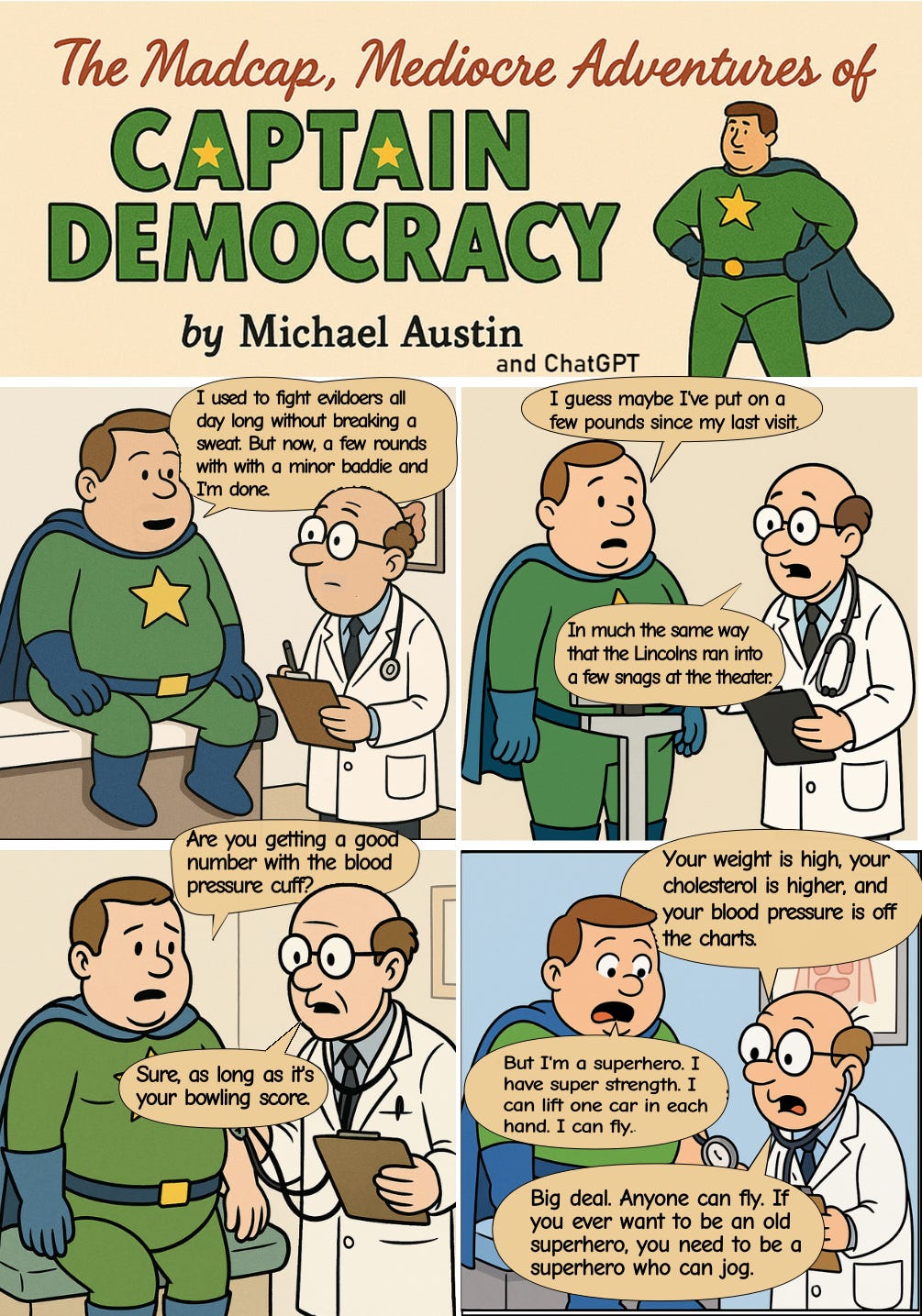 Captain Democracy is a combination of political interest, snark, and my increasing fascination with the creative potential of Artificial Intelligence. I have wanted to be a comic book artist for many years, but I can’t draw a stick figure to save my life. In collaboration with ChatGPT, however, I have found that I can live my dream and have an AI bot draw the pictures. Thus was born Captain Democracy: the hero we deserve.