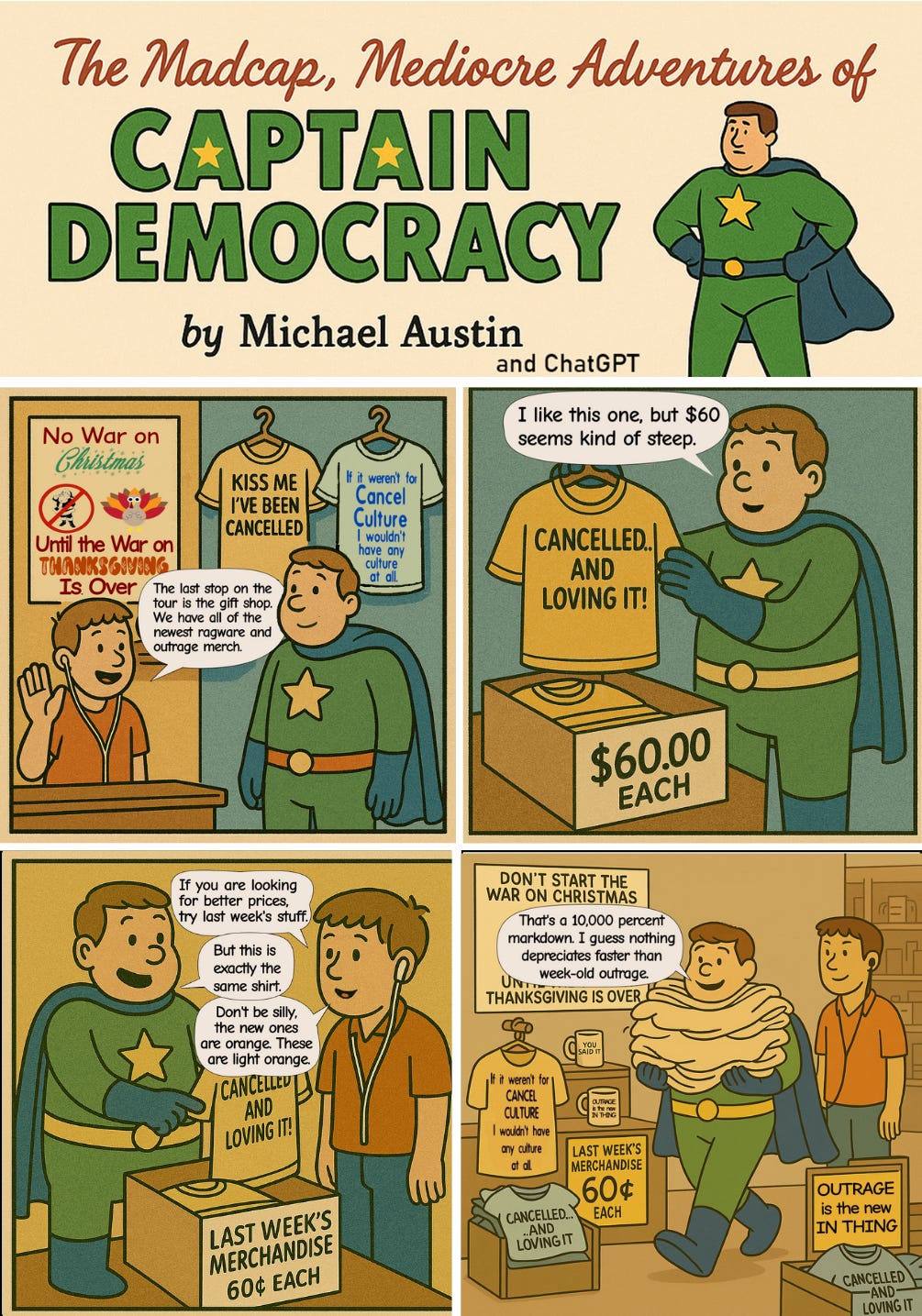 Captain Democracy is a combination of political interest, snark, and my increasing fascination with the creative potential of Artificial Intelligence. I have wanted to be a comic book artist for many years, but I can’t draw a stick figure to save my life. In collaboration with ChatGPT, however, I have found that I can live my dream and have an AI bot draw the pictures. Thus was born Captain Democracy: the hero we deserve. New episodes of Captain Democracy are published 3 times a week, on Mondays, Wednesdays, and Fridays.