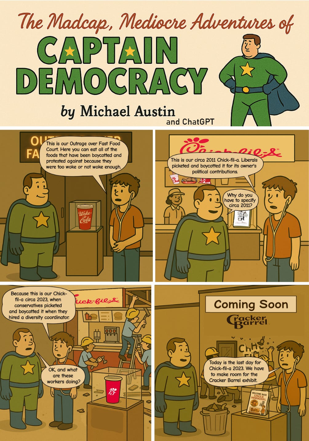 Captain Democracy is a combination of political interest, snark, and my increasing fascination with the creative potential of Artificial Intelligence. I have wanted to be a comic book artist for many years, but I can’t draw a stick figure to save my life. In collaboration with ChatGPT, however, I have found that I can live my dream and have an AI bot draw the pictures. Thus was born Captain Democracy: the hero we deserve. New episodes of Captain Democracy are published 3 times a week, on Mondays, Wednesdays, and Fridays.