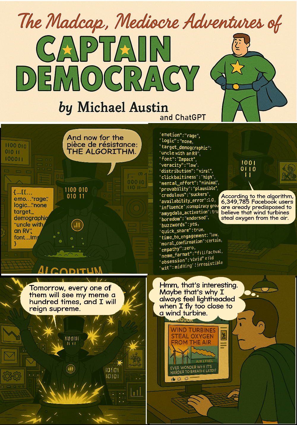 Captain Democracy is a combination of political interest, snark, and my increasing fascination with the creative potential of Artificial Intelligence. I have wanted to be a comic book artist for many years, but I can’t draw a stick figure to save my life. In collaboration with ChatGPT, however, I have found that I can live my dream and have an AI bot draw the pictures. Thus was born Captain Democracy: the hero we deserve.