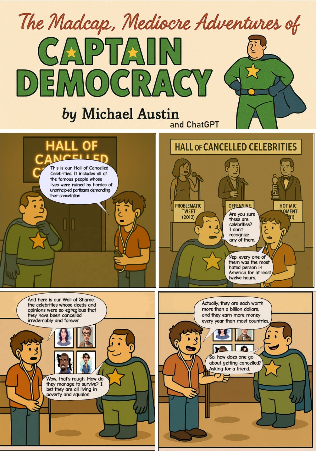 Captain Democracy is a combination of political interest, snark, and my increasing fascination with the creative potential of Artificial Intelligence. I have wanted to be a comic book artist for many years, but I can’t draw a stick figure to save my life. In collaboration with ChatGPT, however, I have found that I can live my dream and have an AI bot draw the pictures. Thus was born Captain Democracy: the hero we deserve. New episodes of Captain Democracy are published 3 times a week, on Mondays, Wednesdays, and Fridays.