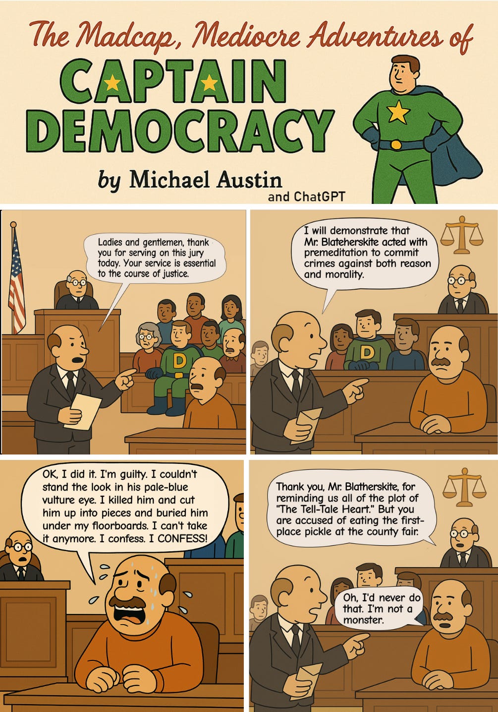 Captain Democracy is a combination of political interest, snark, and my increasing fascination with the creative potential of Artificial Intelligence. I have wanted to be a comic book artist for many years, but I can’t draw a stick figure to save my life. In collaboration with ChatGPT, however, I have found that I can live my dream and have an AI bot draw the pictures. Thus was born Captain Democracy: the hero we deserve.