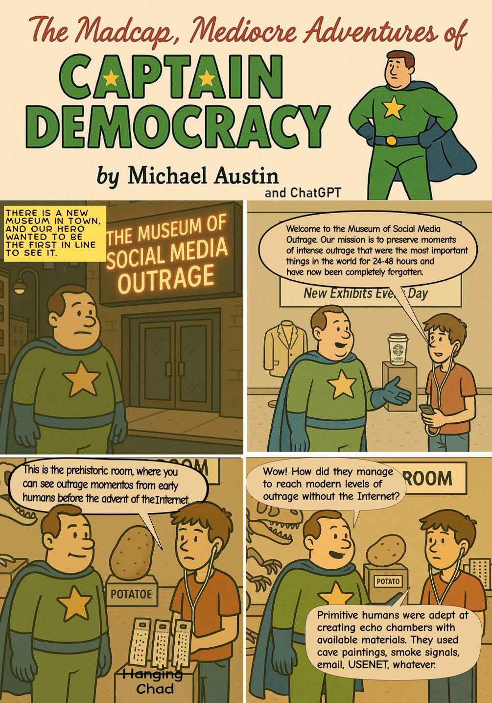 Captain Democracy is a combination of political interest, snark, and my increasing fascination with the creative potential of Artificial Intelligence. I have wanted to be a comic book artist for many years, but I can’t draw a stick figure to save my life. In collaboration with ChatGPT, however, I have found that I can live my dream and have an AI bot draw the pictures. Thus was born Captain Democracy: the hero we deserve. New episodes of Captain Democracy are published 3 times a week, on Mondays, Wednesdays, and Fridays.