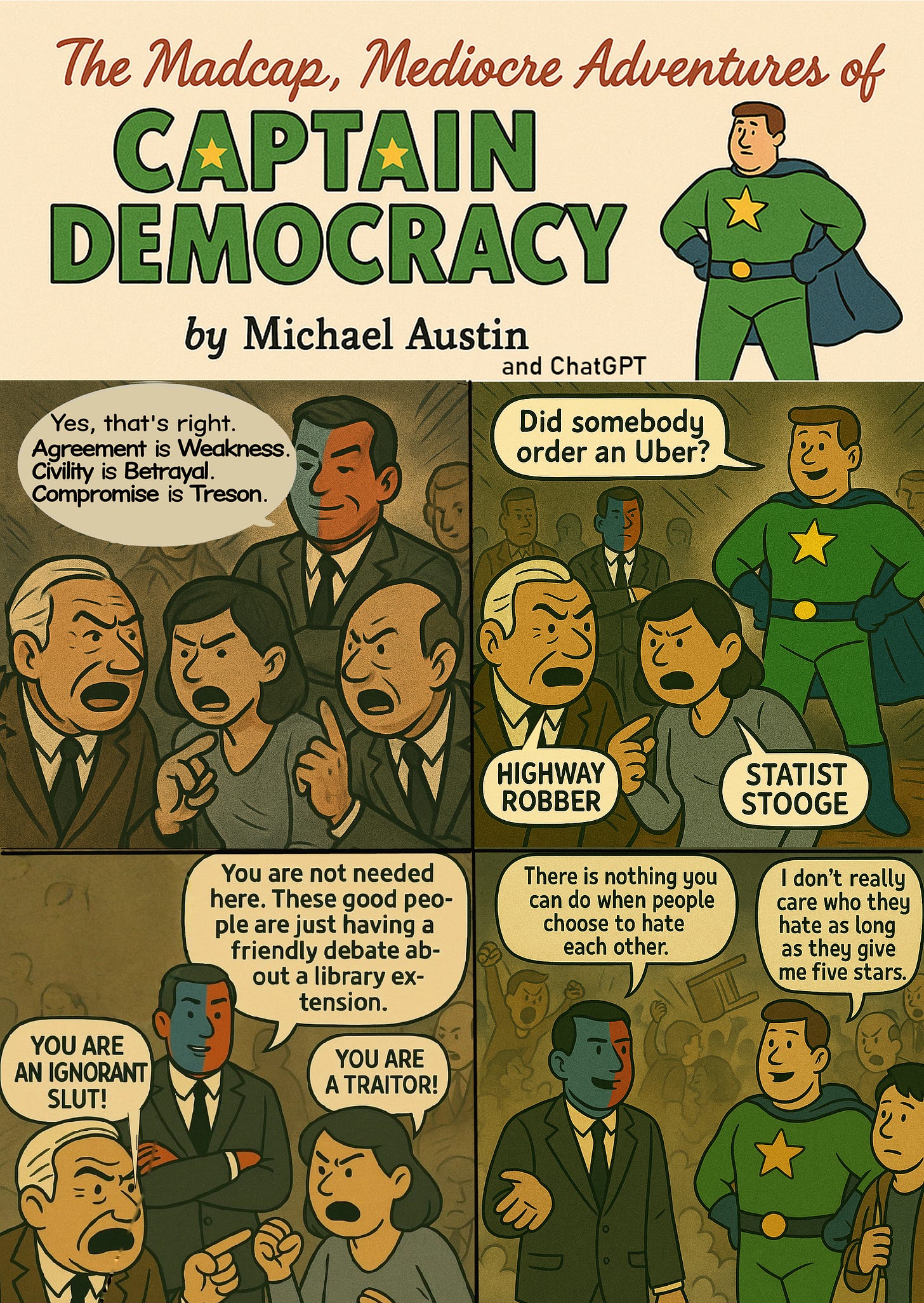 Captain Democracy is a combination of political interest, snark, and my increasing fascination with the creative potential of Artificial Intelligence. I have wanted to be a comic book artist for many years, but I can’t draw a stick figure to save my life. In collaboration with ChatGPT, however, I have found that I can live my dream and have an AI bot draw the pictures. Thus was born Captain Democracy: the hero we deserve. New episodes of Captain Democracy are published 3 times a week, on Mondays, Wednesdays, and Fridays.