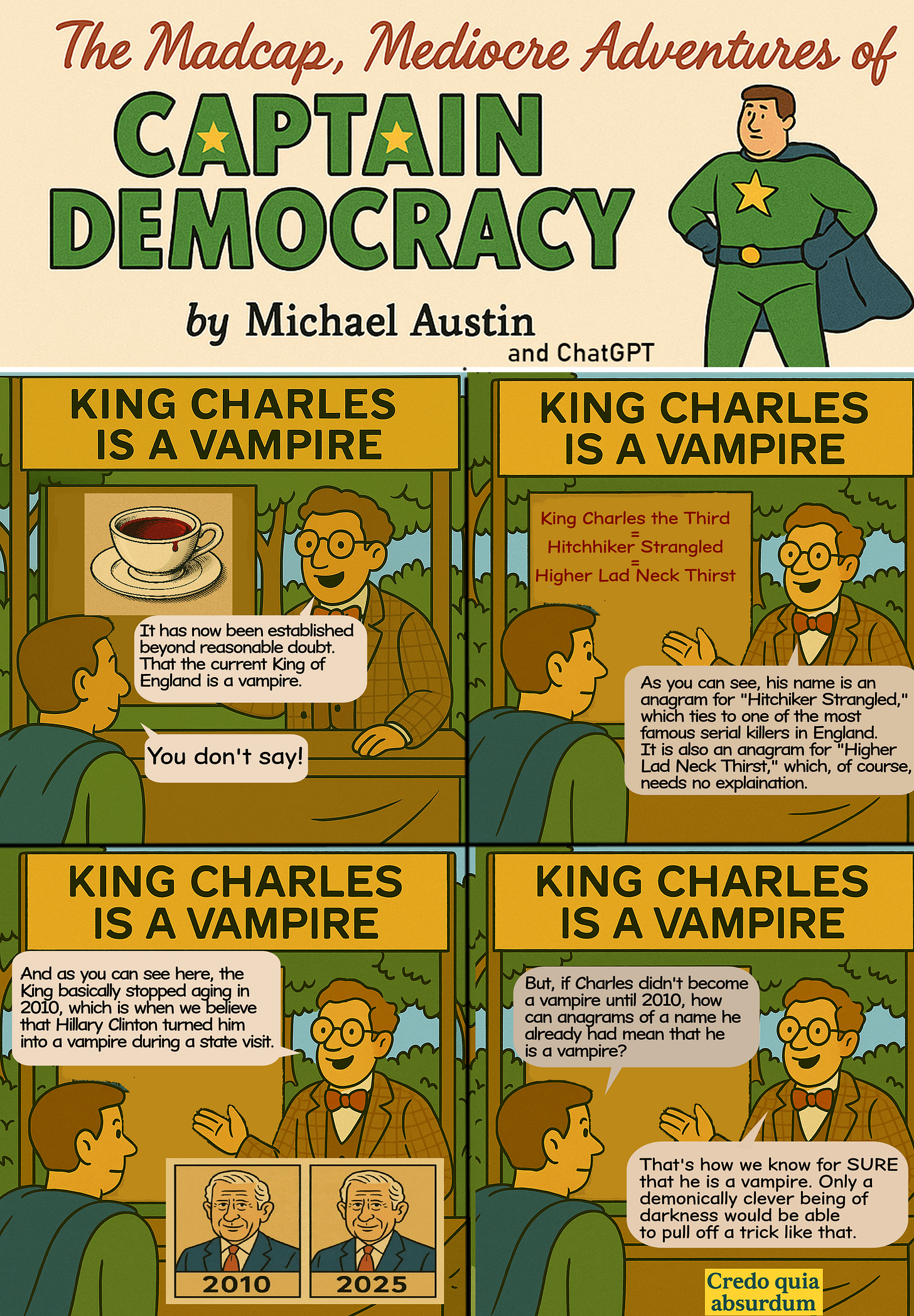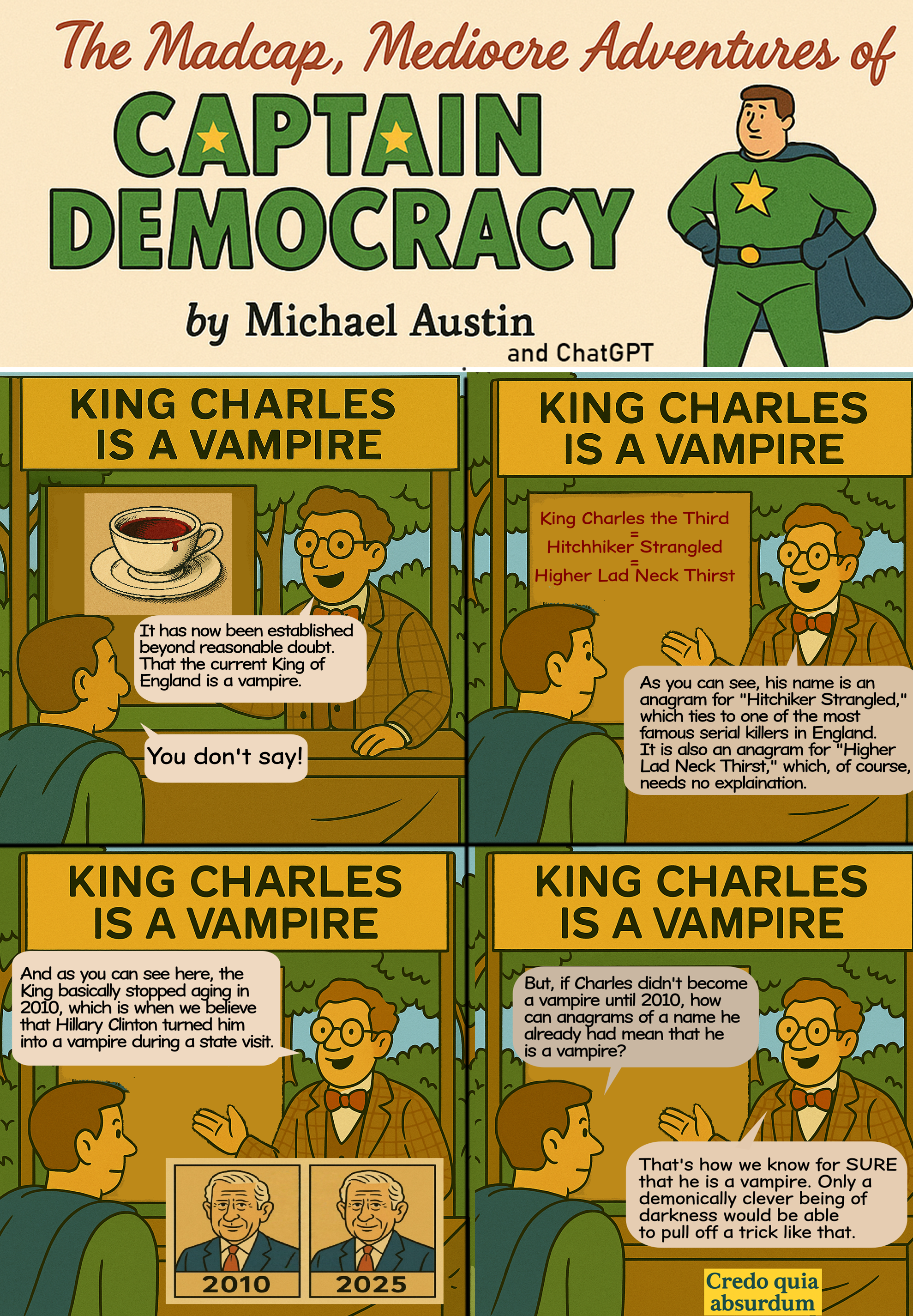Captain Democracy is a combination of political interest, snark, and my increasing fascination with the creative potential of Artificial Intelligence. I have wanted to be a comic book artist for many years, but I can’t draw a stick figure to save my life. In collaboration with ChatGPT, however, I have found that I can live my dream and have an AI bot draw the pictures. Thus was born Captain Democracy: the hero we deserve.