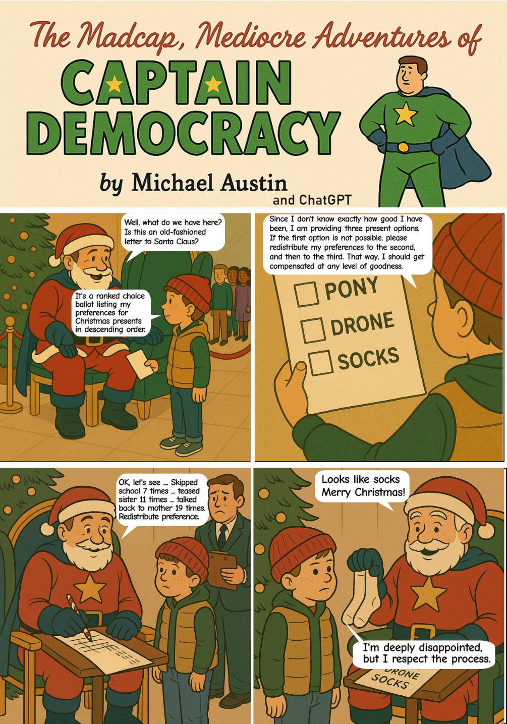 Captain Democracy is a combination of political interest, snark, and my increasing fascination with the creative potential of Artificial Intelligence. I have wanted to be a comic book artist for many years, but I can’t draw a stick figure to save my life. In collaboration with ChatGPT, however, I have found that I can live my dream and have an AI bot draw the pictures. Thus was born Captain Democracy: the hero we deserve.
