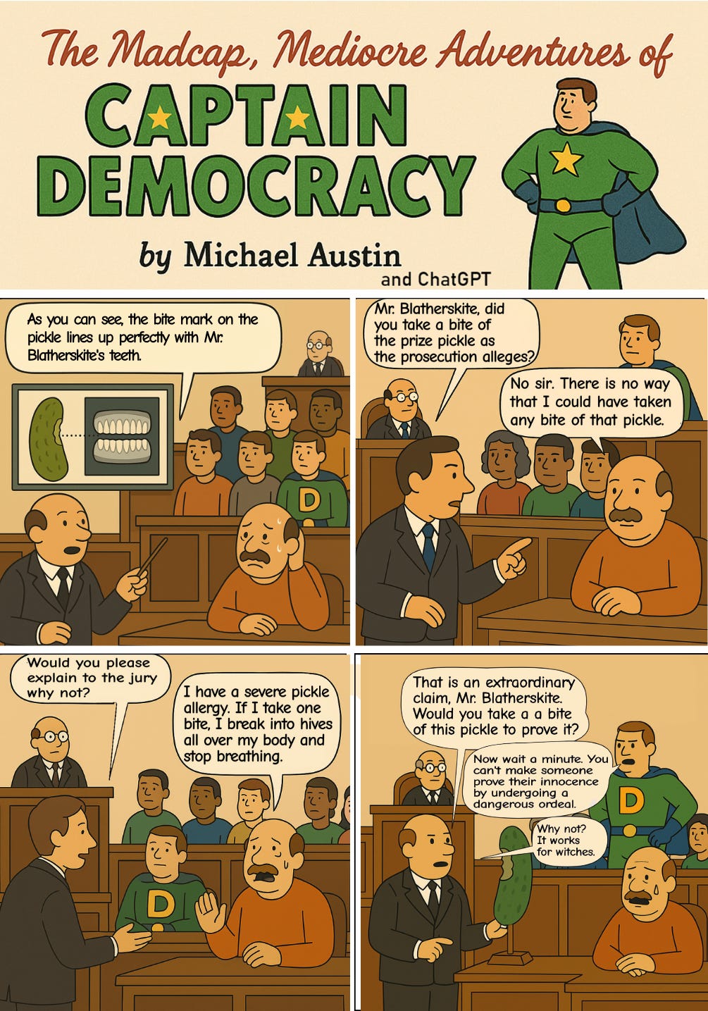 Captain Democracy is a combination of political interest, snark, and my increasing fascination with the creative potential of Artificial Intelligence. I have wanted to be a comic book artist for many years, but I can’t draw a stick figure to save my life. In collaboration with ChatGPT, however, I have found that I can live my dream and have an AI bot draw the pictures. Thus was born Captain Democracy: the hero we deserve.