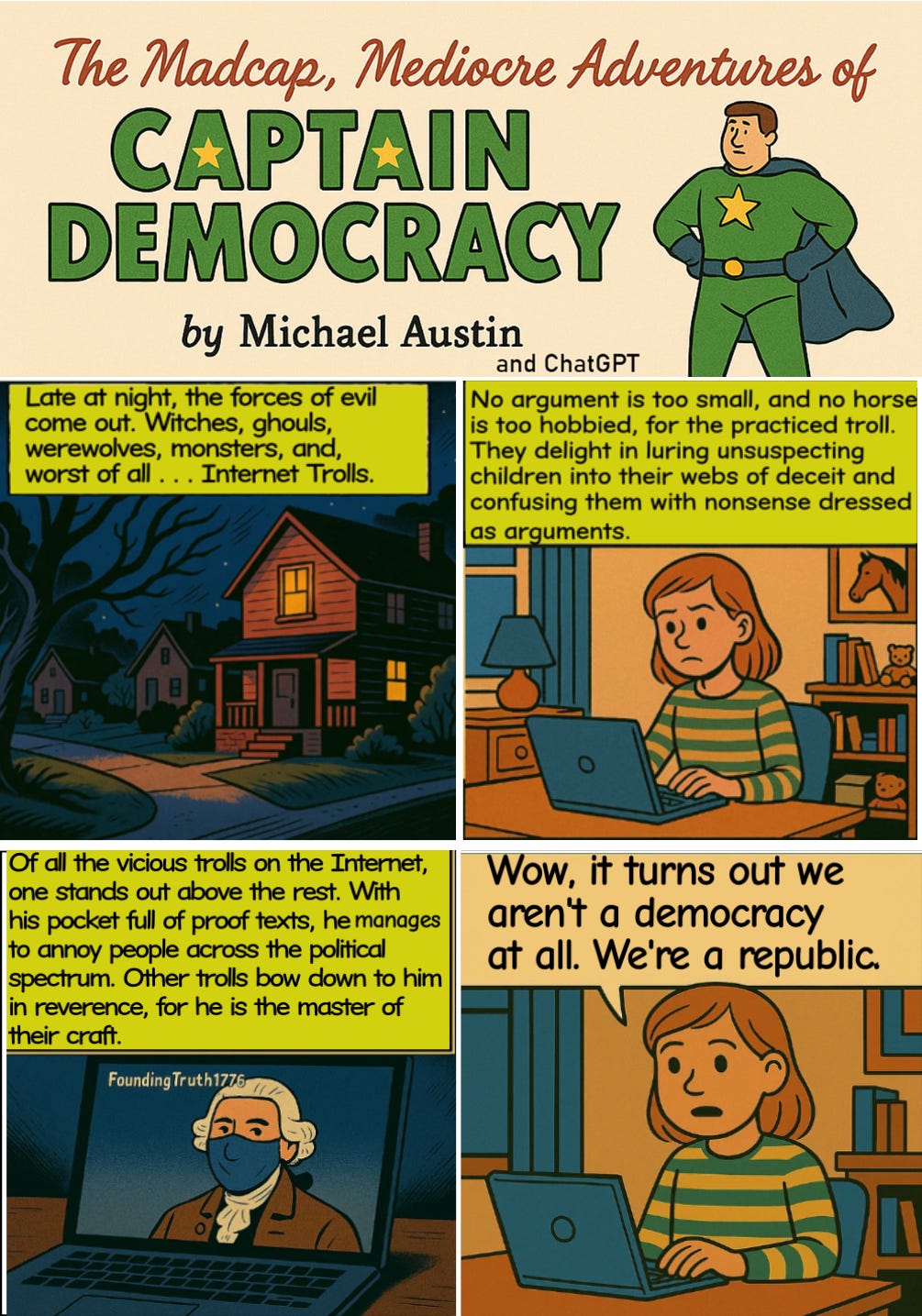 Captain Democracy is a combination of political interest, snark, and my increasing fascination with the creative potential of Artificial Intelligence. I have wanted to be a comic book artist for many years, but I can’t draw a stick figure to save my life. In collaboration with ChatGPT, however, I have found that I can live my dream and have an AI bot draw the pictures. Thus was born Captain Democracy: the hero we deserve.