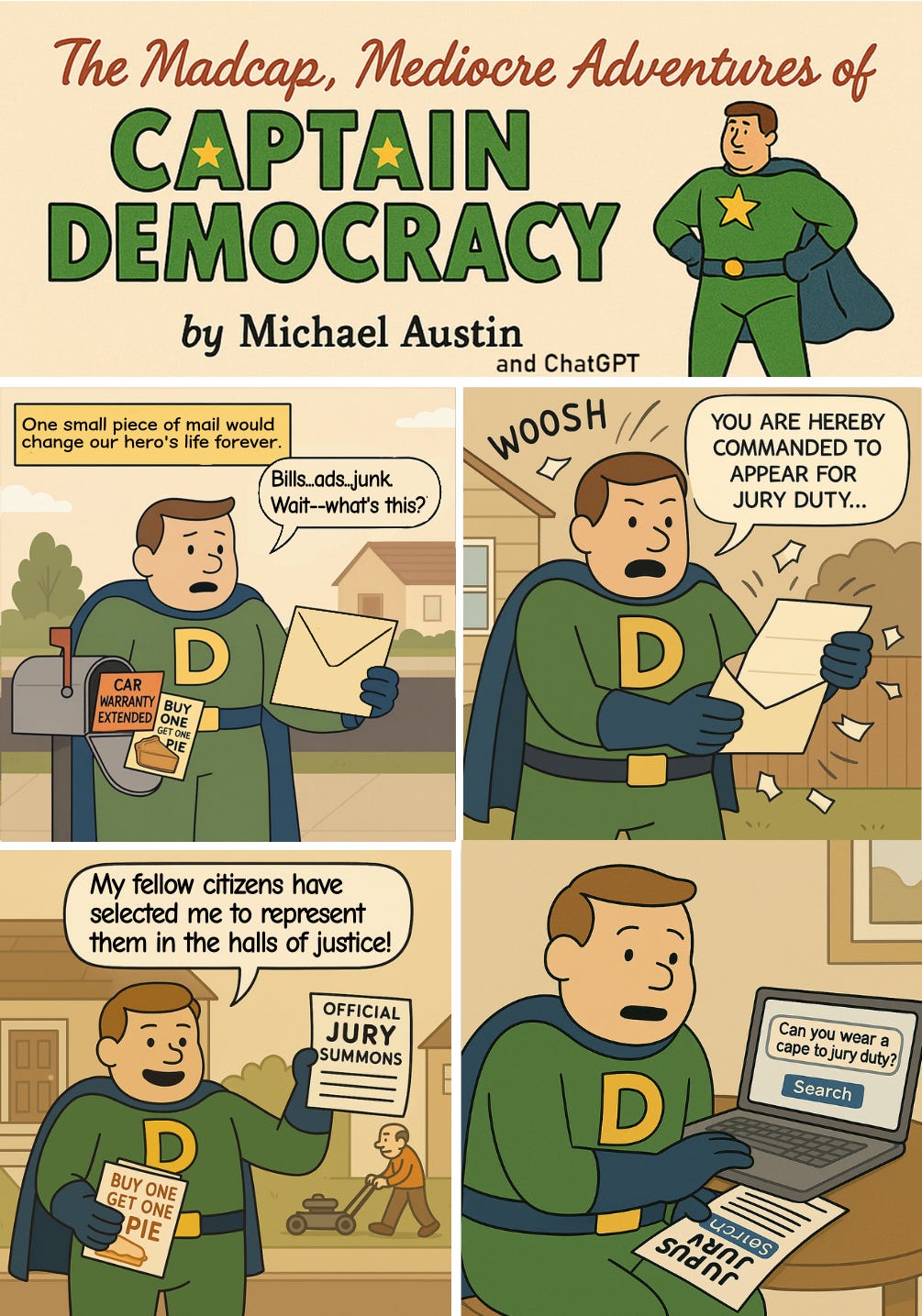 Captain Democracy is a combination of political interest, snark, and my increasing fascination with the creative potential of Artificial Intelligence. I have wanted to be a comic book artist for many years, but I can’t draw a stick figure to save my life. In collaboration with ChatGPT, however, I have found that I can live my dream and have an AI bot draw the pictures. Thus was born Captain Democracy: the hero we deserve.