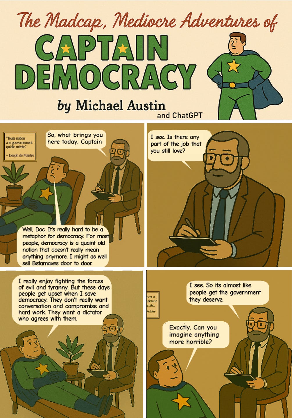 Captain Democracy is a combination of political interest, snark, and my increasing fascination with the creative potential of Artificial Intelligence. I have wanted to be a comic book artist for many years, but I can’t draw a stick figure to save my life. In collaboration with ChatGPT, however, I have found that I can live my dream and have an AI bot draw the pictures. Thus was born Captain Democracy: the hero we deserve.